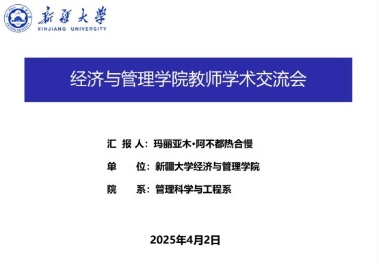 本次汇报交流的主要内容包括:一是自身研究方向相关的国家战略、新疆现实发展的痛点问题及其背后对应的科学问题;二是自身的学术规划、想形成的学术脸谱,以及研究可能所属的一级学科、二级学科;三是自身研究中可能合作的人员和团队;四是自身研究中可以合作的政府部门和企业;五是目前研究中碰到的问题,以及希望学院提供的具体帮助。