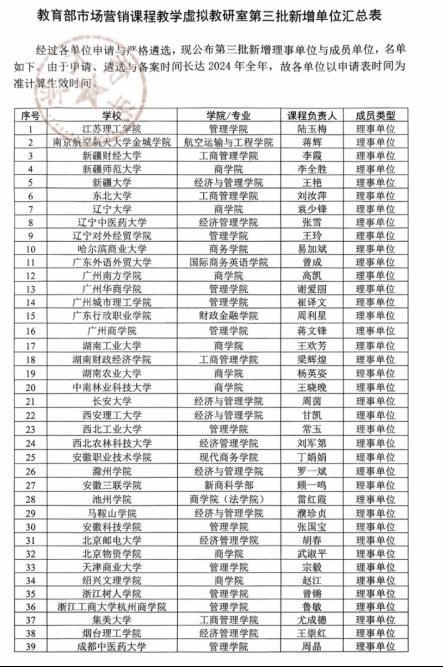 近日,教育部市场营销课程教学虚拟教研室正式公布了第三批理事单位名单,新葡的京官网经过申报遴选后成功入选,课程负责人为王艳老师。